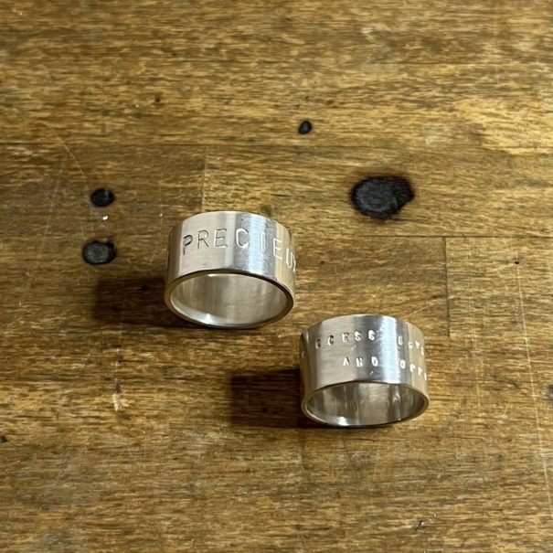 Réalisez, pendant cet atelier d’une durée de 4 heures, une bague large unisexe en argent. En partant d’une plaque d’argent, découpée par vos soins, vous découvrez comment prendre les mesures pour adapter cet anneau à votre doigt et y composer votre texte à l’aide de poinçons et du marteau. Après une brasure au chalumeau et quelques finitions, vous serez fier.e d’avoir réaliser vous-même cette bague.